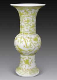 成化黄彩龙凤呈祥纹花觚:高29.5cm、宽14cm。