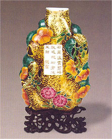 器高17.1、口径3.1厘米。山石形琢器,短颈,小直口。瓶口两侧至足堆塑镂空松树、菊花纹,施红、绿、黄粉彩,器物正面为白釉开光,开光内用金彩题御诗一首,诗的左下方钤“自鸣”二方白文印章。此瓶制作精工,画图精细,是同类器中的佳作。