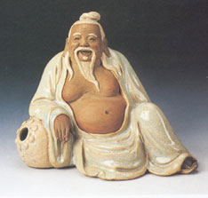 高16厘米。毕卓身着长袖宽衣,倚坛席地而坐,头束发髻,白长胡须,肚皮外露,喜笑颜开,不似通常醉卧形象,可见别出新意的创作。施青白釉有开片。座内盖一方一圆印,方印为“霍津”二字,圆印为“广州二沙头东源窑作”。霍津,民国年间陶塑名家,以制动物和人物闻名。曾受聘于冠华窑,专事仿制黄炳、陈渭岩等名家作品。